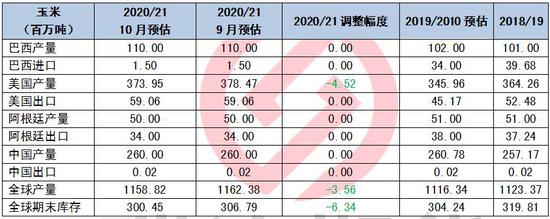 美国农业部(USDA)公布的10月供需报告显示,全球2020/21年度玉米年末库存预估下调至3.0045亿吨,比9月预估减少634万吨,比2019/20年度减少379万吨。从图中可以看出,美国玉米产量下调是全球产量下降的主因,按最新预估,2018/19至2020/21年度全球玉米期末库存连续三个年度下降。