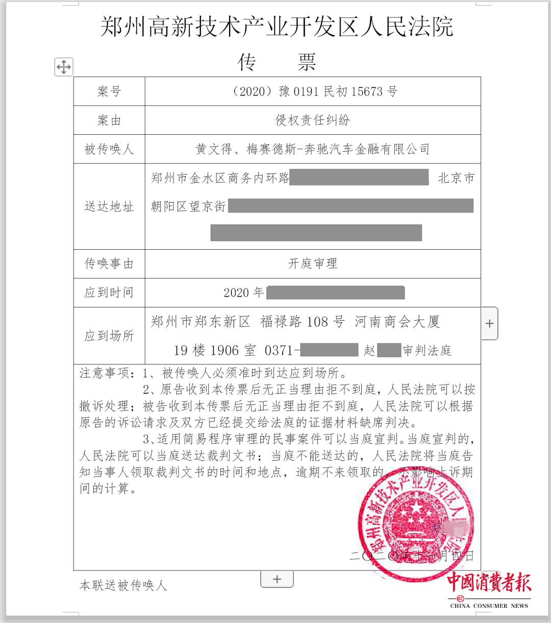 《中国消费者报》记者获悉,黄文得已经将“奔驰金融公司”告上郑州高新技术产业开发区人民法院。