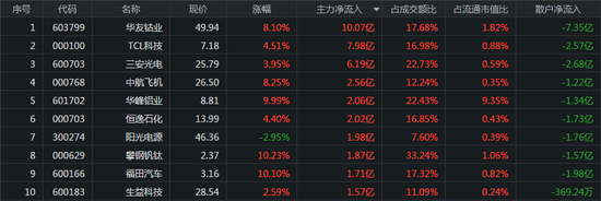 从个股来看,主力资金最青睐的3只股票分别是华友钴业、TCL科技、三安光电,流入金额分别为10.07亿元、7.98亿元、6.19亿元,所对应的涨幅分别为8.10%、4.51%、3.95%。