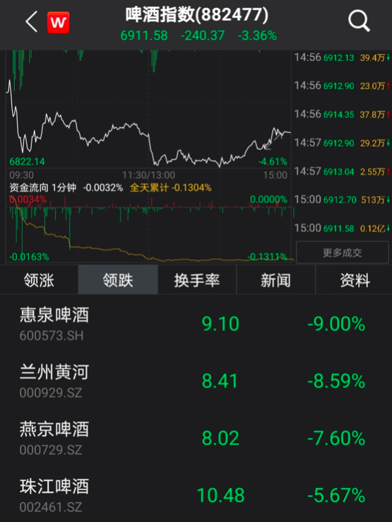 而昨日大涨3.6%的啤酒指数,今日也重挫3.36%。惠泉啤酒盘中跌停,收盘跌9%;珠江啤酒收跌逾5%,燕京啤酒跌超7%,兰州黄河跌超8%。