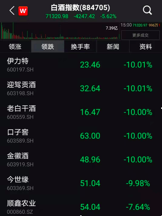 Wind数据显示,昨日大涨5.07%的白酒指数今天骤然大跌5.62%。截至收盘,伊力特、迎驾贡酒、老白干酒、口子窖、金徽酒等纷纷跌停,今世缘跌幅9.98%,距离跌停也仅差1分钱。