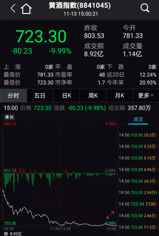 黄酒行业的会稽山、金枫酒业、古越龙山等三只股票全线跌停,更是导致黄酒指数也被摁在了跌停板上;此外,葡萄酒行业的张裕A跌停,莫高股份跌9.6%。