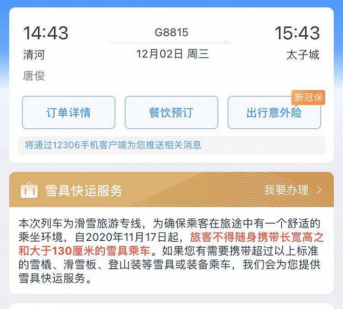 界面新闻记者通过12306平台预订了一张从北京市清河站到张家口太子城站的高铁票,订票页面显示如下信息:“本次列车为滑雪旅游专线,为确保乘客有舒适的乘车环境,自2020年11月17日起,旅客不得携带长宽高之和大于130厘米的雪具乘车,如有需要可使用铁路部门提供的雪具快运服务。”