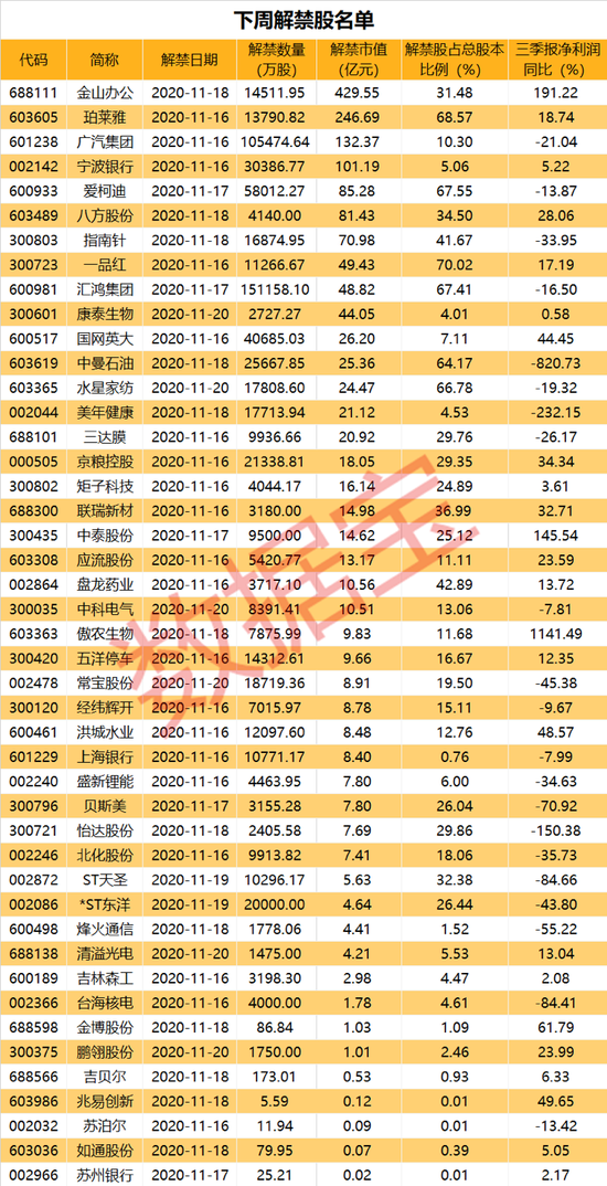 下周将有45只股解禁,按照最新收盘价计算,合计解禁市值1617.17亿元。7股解禁市值在50亿元以上,分别是金山办公、珀莱雅、广汽集团、宁波银行、爱柯迪、八方股份、指南针。