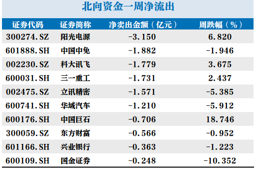 本周净卖出额居前三的股票分别是阳光电源、中国中免、科大讯飞,净卖出额为3.15亿元、1.88亿元、1.78亿元。