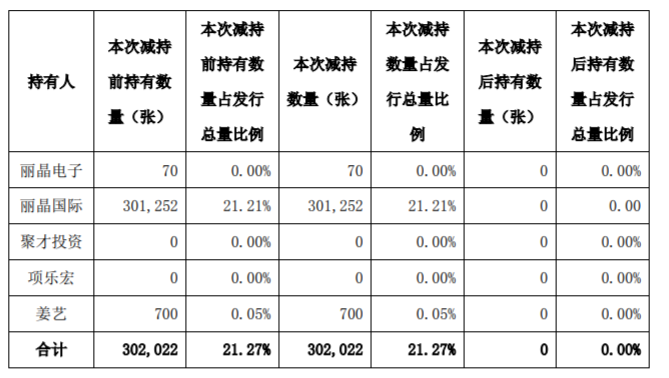 减持进程来看,聚财投资分别在11日、12日减持9.86%、0.51%(减持数量占发行总量比例,下同)的转债;丽晶电子在12日减持完手中转债;股东姜艺分别在11日、12日、13日减持1.20%、2.11%、0.05%的转债;丽晶国际于13日减持完持有的21.21%的乐歌转债。