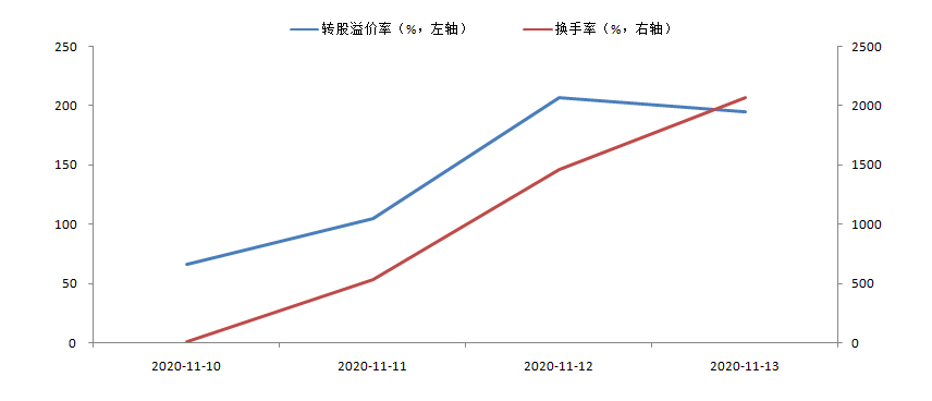 虽然中签率创新低且近来新债上市大涨已成 “惯例”,但乐歌转债还是显得有点过火。一大原因在于,乐歌转债大涨同时,乐歌股份却在下跌。毫无意外,乐歌转债转股溢价率节节攀升。从换手率也可以看出,交易明显过热。事实上,乐歌转债发行量仅1.42亿元,是典型的小盘债,容易被作为炒作标的。
