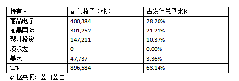乐歌转债在配售时也获得大股东青睐。公司公告显示,乐歌股份实际控制人项乐宏、姜艺及其一致行动人宁波丽晶电子集团有限公司(以下简称“丽晶电子”)、麗晶(香港)國際有限公司(以下简称“丽晶国际”)、宁波聚才投资有限公司(以下简称“聚才投资”)共计配售乐歌转债896,584张,占本次发行总量的63.14%。