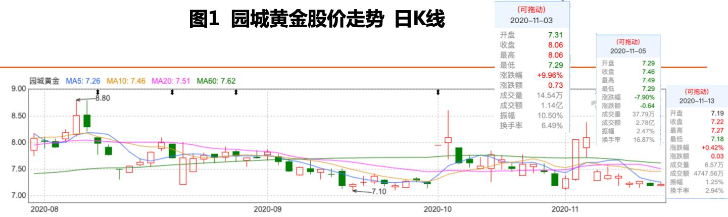 受上述消息影响,11月5日,园城黄金开盘跌停,报7.29元/股,之后在三大股指接连上涨的带动下,股价小幅反弹,但随后,园城黄金股价仍逐步走低,截至11月13日收盘,园城黄金股价收于7.22元/股。