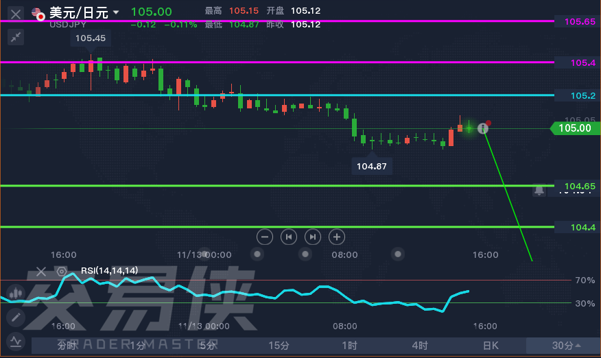 只要104.90阻力位不被突破,美元/日元向下跌破104.55位置的风险很高,若跌破或进一步下探104.35。若能突破104.90则看涨,上方第一阻力在105.15,第二阻力在105.35。