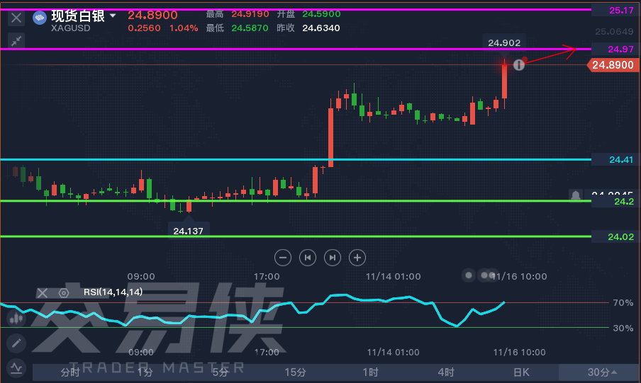 现货白银在24.41出现多空转折,目前已突破第一阻力24.97,接下来留意25.17和25.49。若下破24.41,跌至24.20、24.02的风险很高。