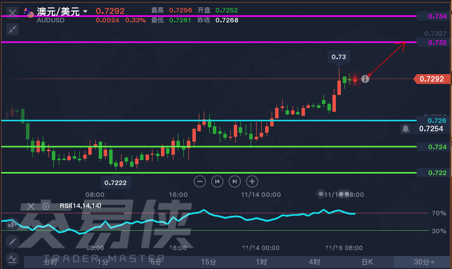 澳元/美元亚盘上破0.73关口,若能保持在0.7260之上运行,或能进一步上涨至0.7320,然后是0.7340。若回落至0.7260下方可转为看空,或跌至0.7240,下一目标是0.7220。