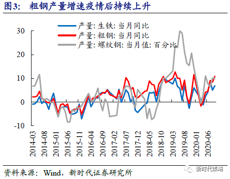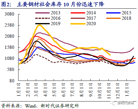 从具体数据来看,由于复工复产的持续推进,工业生产非常旺盛,粗钢产量增速自疫情后持续回升,目前已接近近5年来的高点;受工业需求旺盛的影响,国内主要钢材的社会库存水平自10月以来迅速下降,且下降的斜率较往年更大。