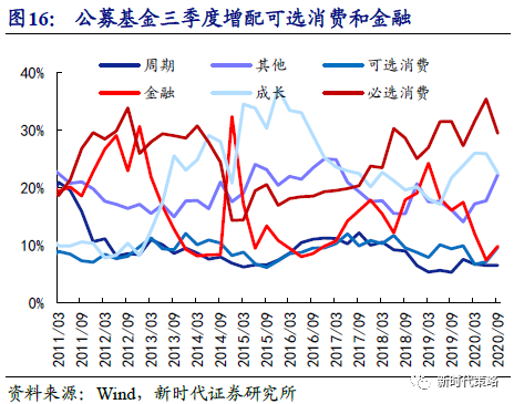 从公募基金三季度调仓情况来看,三季度公募基金在必选消费、可选消费、成长、金融、周期及其他的持股市值占比依次为29.42%、9.85%、22.48%、9.81%、6.46%和22.25%,与2020年二季度相比,环比变化依次为-5.99、2.48、-3.44、2.41、-0.03和4.56个百分点,大幅减配必选消费、成长板块,增配可选消费和金融板块。我们认为从外资和机构的调仓脉络中可以看出,经济复苏带来的顺周期的投资机会已经为两类大资金所重视,后续随着经济复苏的扩散,这种认知将会继续强化。