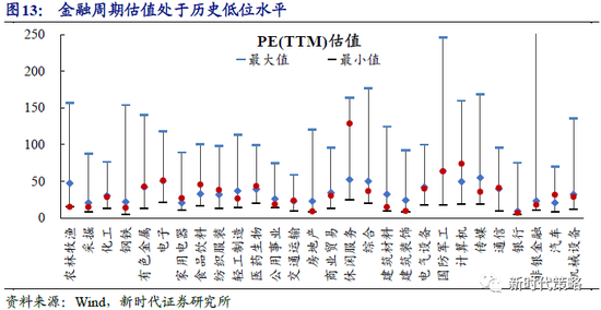 (2)估值透视:金融周期行业仍具有估值优势。从各行业PE(TTM)来看,前期的主线板块中,医药、电子等行业经过了一个季度的杀估值行情,目前估值水位已大幅下降,均已回落至历史中位数附近。食品饮料、计算机、休闲服务仍显著高于历史中位数。同时,钢铁、采掘、公用事业、房地产、建材、建筑装饰、银行等金融周期行业的估值水平仍处于历史低位。