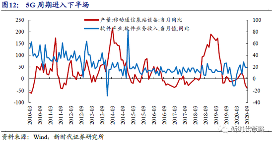 另一方面,5G周期正在进入下半场。从最近的数据来看,软件产业业务收入增速在上升,已经处于近5年中的较高水平,而移动通信基站设备产量增速不断下降,已跌至2012年以来的新低。我们认为这主要源于5G基建的高峰(金麒麟分析师)已过,而5G应用的需求却刚刚开始放量,“路”修好后,接下来就是“通车”。所以软件收入和基站设备产量增速之间表现出了背离的“喇叭口”。而同样的情形也出现在了2014年下半年-2017年,时间上看也刚好是上一轮4G周期。所以成长股方面,除了应用非常广泛的半导体之外,5G周期的演变进程值得重点关注。