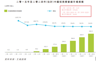 据艾瑞咨询,中国的短视频营销产生收入将由2020年的1724亿,预计到2024年增至5825亿。平台投放广告收入预期由2020年的1335亿以复合年增长率31.2%的速度增至2024年的3950亿。