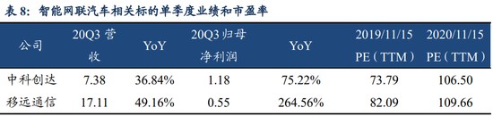 该团队预计未来行业高景气的情况下,相关标的业绩仍将维持快速增长,建议长期关注智能网联汽车、无人驾驶、车路协同等细分赛道相关标的。