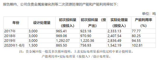 因此,废催化剂处理量不应与初次投料量(按产出)为相同概念。若按2016年版为基础,即废催化剂处理量与实际处理量为同一概念,数额相等。则2020年版招股书披露的2017年-2019年实际处理量应分别为923.18吨、970.90吨、1220.36吨。同期设计处理量均为3000吨,由此计算出的真实产能利用率分别为30.77%、32.36%、40.68%。