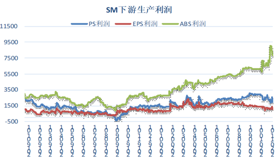 3. 苯乙烯生产利润3000以上,处于利润高位,上行受限:苯乙烯上游纯苯跟随调涨,纯苯涨幅200元/吨,涨幅不及苯乙烯,苯乙烯利润再次走高,需关注纯苯在库存高位下,跟随苯乙烯的大涨能否持续,且纯苯利润也在高位,尽管纯苯如果走弱,并不能带动苯乙烯走弱,但成本端支撑走弱下,对纯苯-苯乙烯套利盘获利了结,或压制苯乙烯上涨。