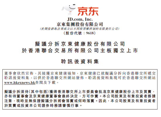 11月15日晚间,京东集团(09618.HK)在港交所公告称,京东健康已就拟议分拆向香港联交所递交聆讯后资料集,这意味着已经顺利通过聆讯环节,并有望成为蚂蚁集团暂缓上市以后香港最大型新股。