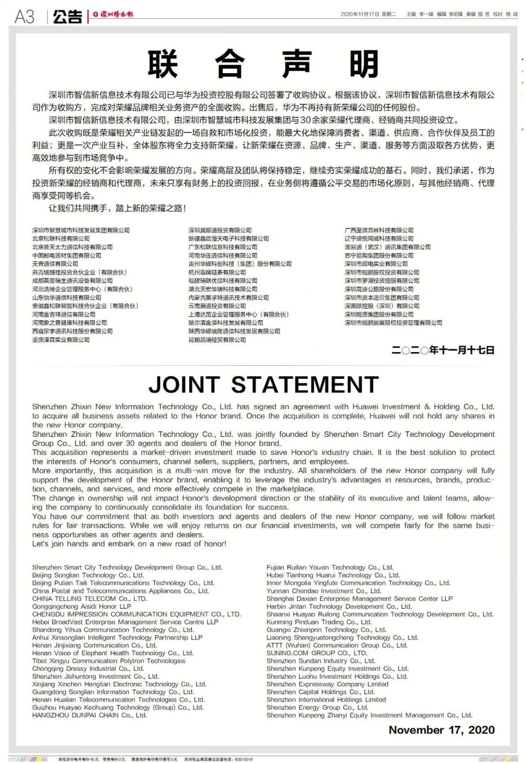 当日,多家企业也在《深圳特区报》发布联合声明,深圳市智信新信息技术有限公司已与华为投资控股有限公司签署了收购协议,完成对荣耀品牌相关业务资产的全面收购。