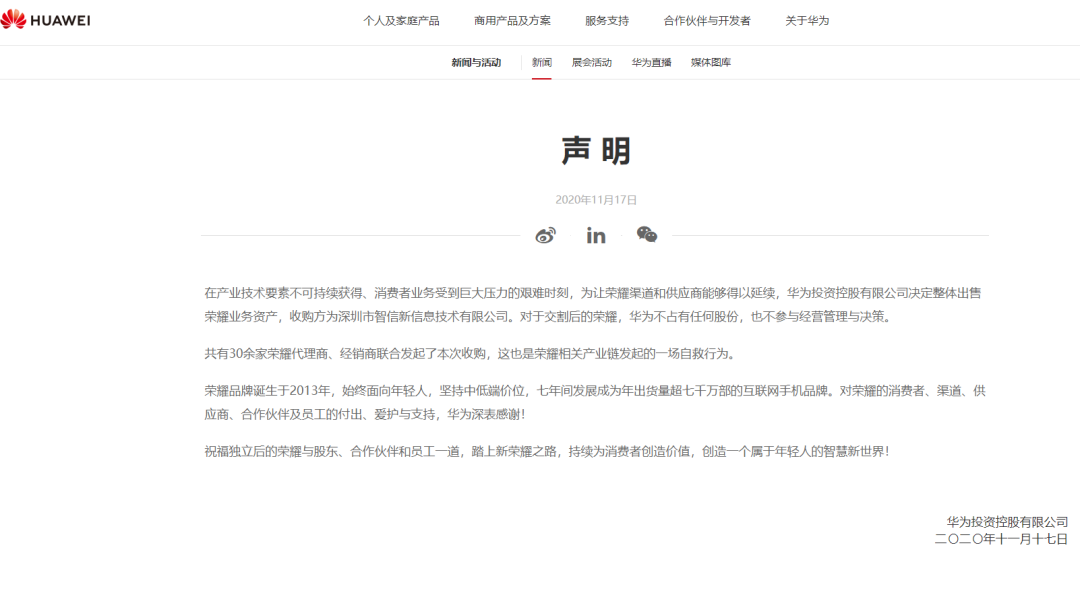 华为表示,在产业技术要素不可持续获得、消费者业务受到巨大压力的艰难时刻,为让荣耀渠道和供应商能够得以延续,华为投资控股有限公司决定整体出售荣耀业务资产,收购方为深圳市智信新信息技术有限公司。对于交割后的荣耀,华为不占有任何股份,也不参与经营管理与决策。