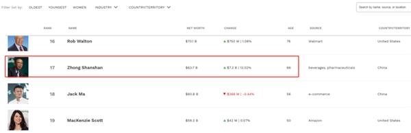根据福布斯实时富豪榜显示,钟睒睒两日身家净增71亿美元,个人身家达到637亿美元,一举超越马云、马化腾,成中国首富,全球富豪榜排名第17名。