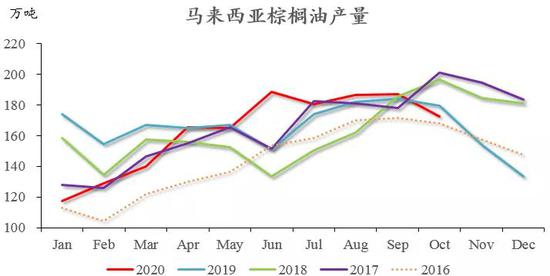另一方面,进入到11月,棕榈油也即将进入减产季节,在劳动力短缺以及偏多降雨的影响下,棕榈油的产量可能会继续下探。值得注意的是,今年的减产季与往年还有不同,今年受拉尼娜效应影响全球气候异常,马来印尼等地降雨大概率增多,同时,新冠疫情仍在蔓延,产地生产多半受限,所以今年的减产季或许更为严重且时间可能更长。