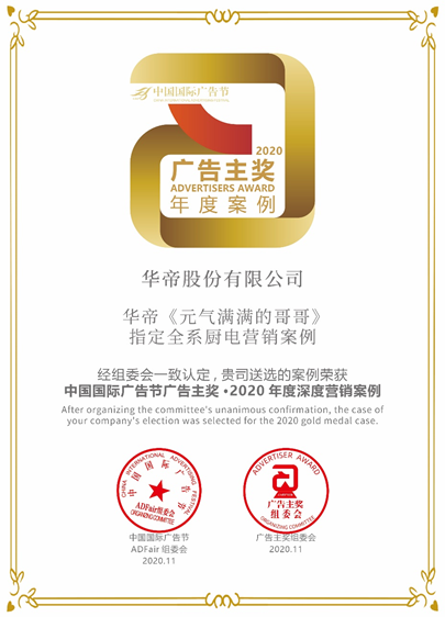 凭借对消费者的全面洞察和营销模式的不断探索创新,华帝在今年的颁奖盛典上成为大赢家,获颁两项大奖。华帝《元气满满的哥哥》指定全系厨电营销案例,荣获中国国际广告节广告主奖-2020年度深度营销案例,《华帝洗碗机乐队》营销案例荣获中国国际广告节广告主奖-2020年度数字营销案例。
