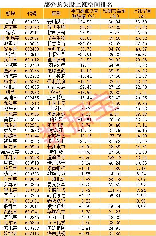 以最新价相比年内高点,部分龙头股调整幅度已经较大。其中,血制品行业中的茅台,华兰生物最新价不足44元,相比高点76元跌幅接近43%。另外,智飞生物、安琪酵母、启明星辰、长春高新等最新价较年内高点跌幅均超过30%,牧原股份、中顺洁柔、双汇发展、隆基股份、海天味业等个股跌幅均超过20%。