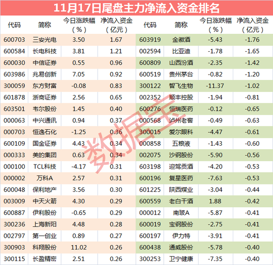 沪指11月17日跌0.21%,主力资金全天净流出423.89亿元,已连续6个交易日资金呈净流出状态。其中,中小板主力资金净流出109.96亿元,创业板主力资金净流出140.27亿元,沪深300成份股主力资金净流出101.76亿元。