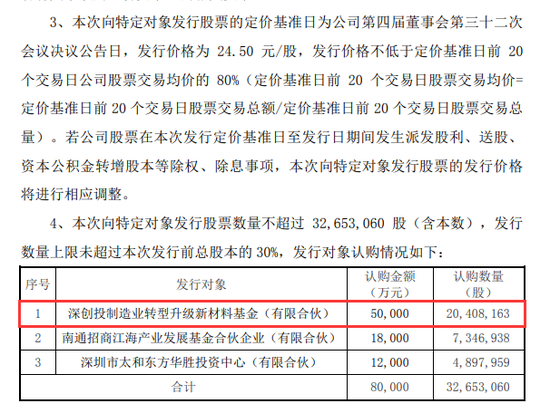 同时,最引人注目的是3名特定对象之一:深创投制造业转型升级新材料基金(有限合伙),该基金认购数量为20,408,163股,合计金额5亿元。该次发行完成后,该基金将成为公司持股5%以上的股东。