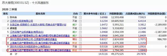 据Wind数据统计,苏大维格3季报的前十大流通股东中,除了东吴证券的一只资管计划持有559万股为第3大股东外,还有多达4只私募基金分居第6、7、8、10大股东。