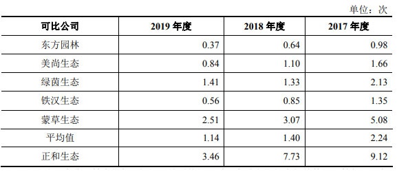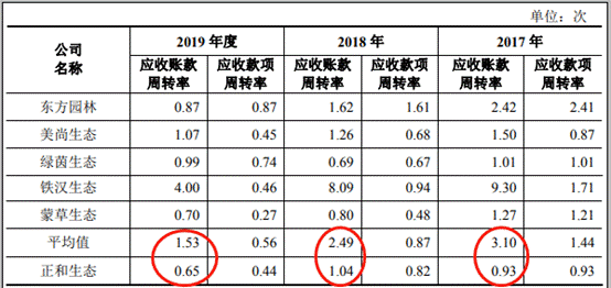 正和生态招股书称,发行人2017年至2019年间的应收款项周转率低于平均水平,主要原因系公司承接的项目主要为国家、省市级重点项目,项目过程计量和进度管理较及时,应收账款余额增加,且由于公司营业收入规模相对可比公司较小,从而形成了公司应收账款周转率低的情形。与应收账款周转率相比,发行人的应收款项周转率与可比上市公司的平均水平差异较小。
