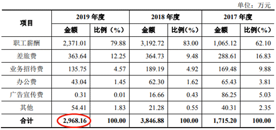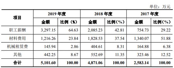 2017年-2019年,正和生态研发费用分别为2583.14万元、4871.06万元、5101.60万元,其中职工薪酬分别为754.73万元、2085.23万元、3297.15万元,占比分别为29.22%、42.81%、64.63%。