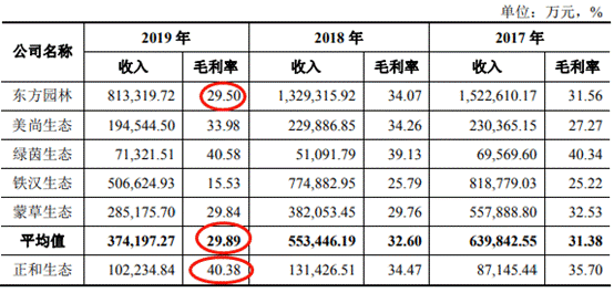 2017至2019年,正和生态毛利率分别为35.70%、34.47%、40.38%。同行平均值分别为31.38%、32.60%、29.89%,其中东方园林毛利率分别为31.56%、34.07%、29.50%。