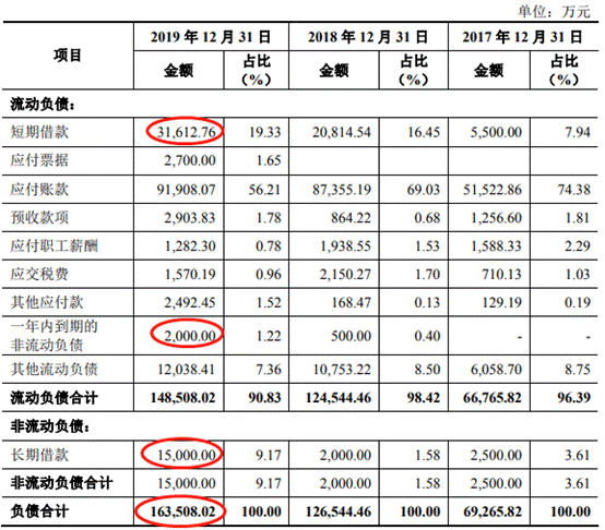 2017年-2019年,正和生态负债合计分别为6.93亿元、12.65亿元、16.35亿元。其中流动负债分别为6.68亿元、12.45亿元、14.85亿元,占比分别为96.39%、98.42%、90.83%。