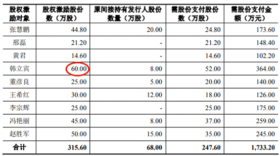 正和生态招股书显示,韩立宾已退出公司高管,退出时间为2017年12月。但2018年3月,正和生态对9名核心员工进行股权激励时,韩立宾是其中享受权激励股数最多的员工。