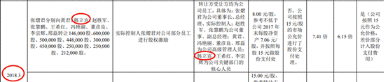 2018年3月20日,正和生态实际控制人张熠君以8元/股的价格向9名公司员工转让股份,其中向韩立宾转让公司股份60.00万股。招股书称,该股权转让为公司对核心人员的股权激励。本次股权激励公允价值为15元/股,定价依据为公司2017年12月最近一次股票发行价格为15元/股。