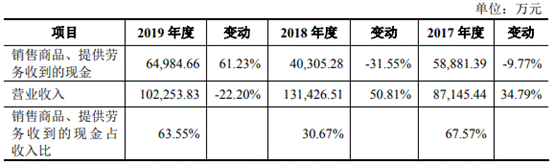 2017年-2019年,正和生态营业收入分别为8.71亿元、13.14亿元、10.23亿元,销售商品、提供劳务收到的现金分别为5.89亿元、4.03亿元、6.50亿元,销售商品、提供劳务收到的现金占收入比分别为67.57%、30.67%、63.55%。