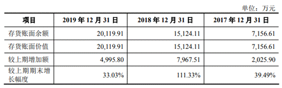 2017年-2019年,正和生态存货账面价值分别为0.72亿元、1.51亿元、2.01亿元,公司存货规模占各期总资产的比例分别为4.60%、6.53%及7.27%。