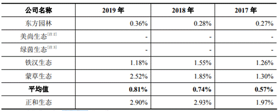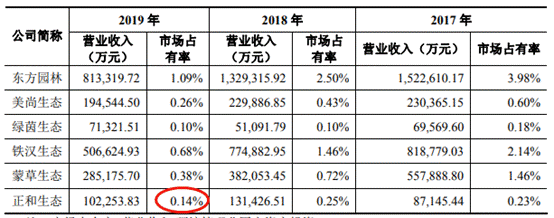 公司本就较低的市占率去年大降44%。2017至2019年,正和生态的市场占有率分别为0.23%、0.25%、0.14%。