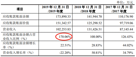 2017年、2018年、2019年,公司营业收入增长率分别为34.79%、50.81%、-22.20%,收账款账面余额增长率分别为44.02%、28.83%、22.51%。