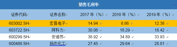 根据公告,2018年至2020上半年,无锡宏仁的毛利率分别为16.34%、22.38%、20.70%,明显低于同行业可比公司安迪苏、扬农化工的毛利率。