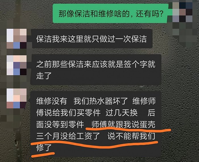 这点同样在连线Insight采访租客时得到印证,一位武汉蛋壳租客表示,在之前询问报修情况时,维修师傅表示已经有三个月没有发工资了,不来维修了。