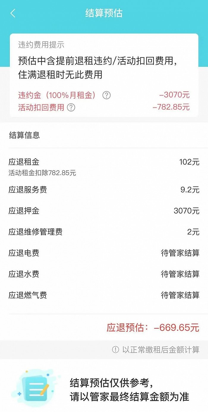 王涵在遭遇以上一系列困扰之后,她选择退租。但是,因为她签的合同是一年的,所以在租满一年前退租后不仅需要承担一个月的违约金,而且还无法拿到押金和所承诺的返现。