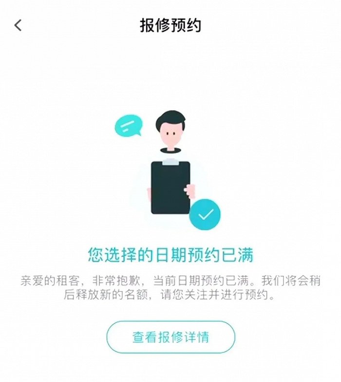 “之前一个月来两次的保洁从10月份开始就没了,报修方面,可以在蛋壳公寓APP上进行操作,但最终显示的‘预约已满’,无论哪个时间段去预约都不行,这就等于说没有。”白洋对连线Insight表示。