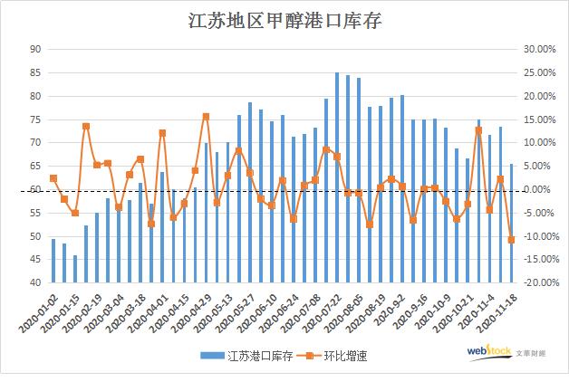 截至11月18日当周,本周甲醇港口库存整体延续去库,港口总库存总计111.72万吨,环比上周减少2.53万吨,降幅2.21%。周内江苏地区去库顺畅,港口总计65.5万吨,去库7.93万吨,降幅10.08%,去库幅度创年内最高纪录。华南地区小幅累库,本周总计13.85万吨,增加0.93万吨。