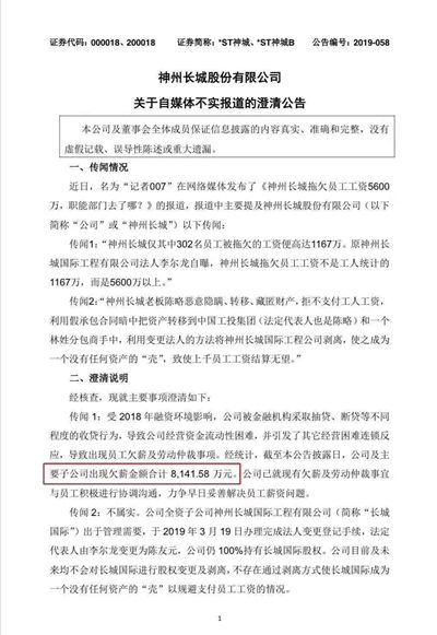 同年5月16日,神州长城正式对外发布了澄清公告,公告中表明,该自媒体报道失实。为了反驳文章中指出的主要问题,对该文章中提及的欠薪5600万元,神州长城予以否认,并表示经过统计,截至公告披露日,公司及主要子公司出现欠薪金额合计8141.58万元,并不是自媒体披露的5600万元。